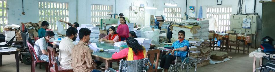 Santhigiri Printing Press is our attempt to employ Youth with Disabilities (YwD). The wheelchair users, even if qualified otherwise may not be able to take up a job elsewhere because of the absence of barrier-free environment. Therefore, we started a printing press mainly to employ the wheelchair users. Some of them also receive training in printing works. Around 25 YwD are employed here. All the printing works of the college and printing works from schools, colleges, parishes and other agencies are undertaken by this unit. This press is economically self-depended and the entire profit is divided among the employees.